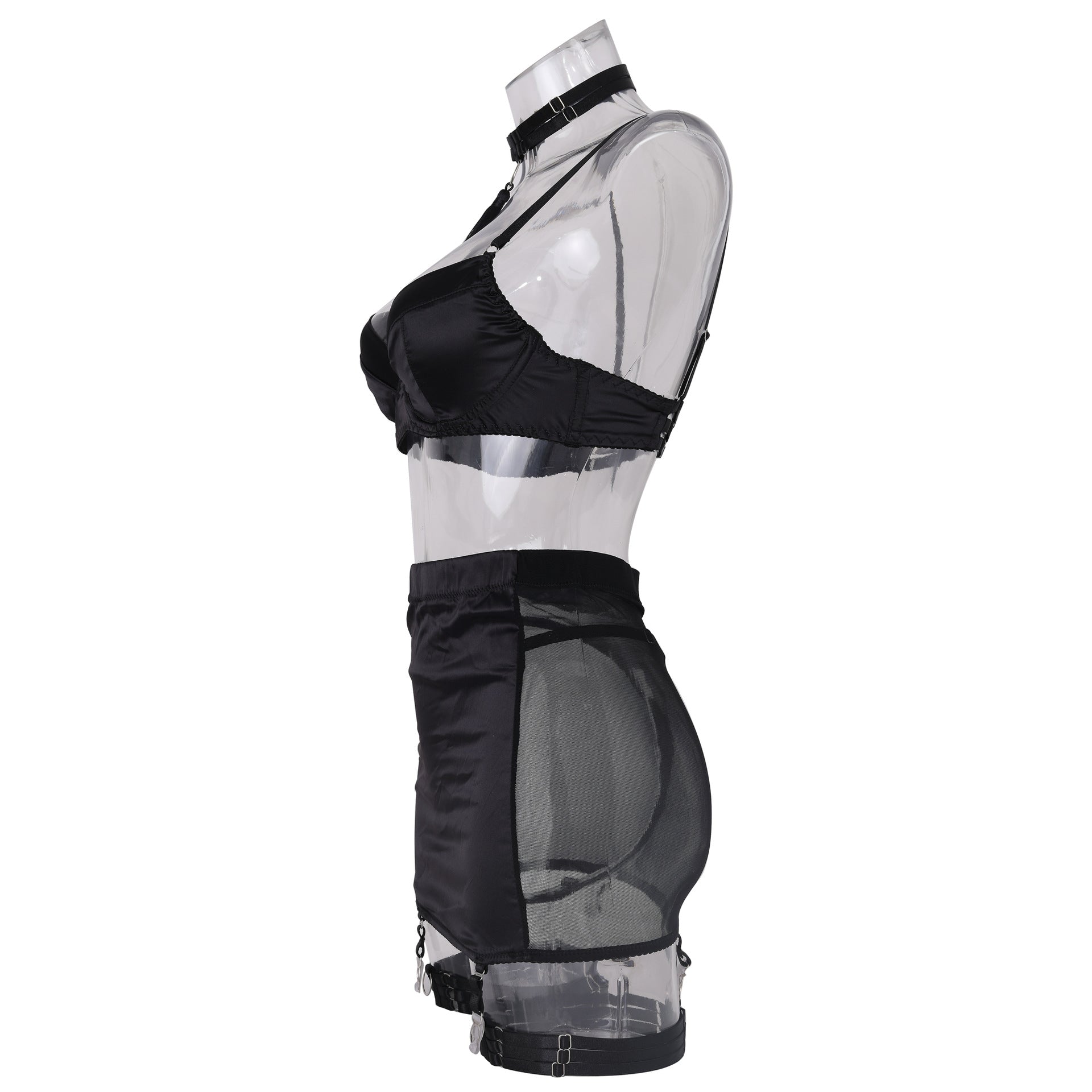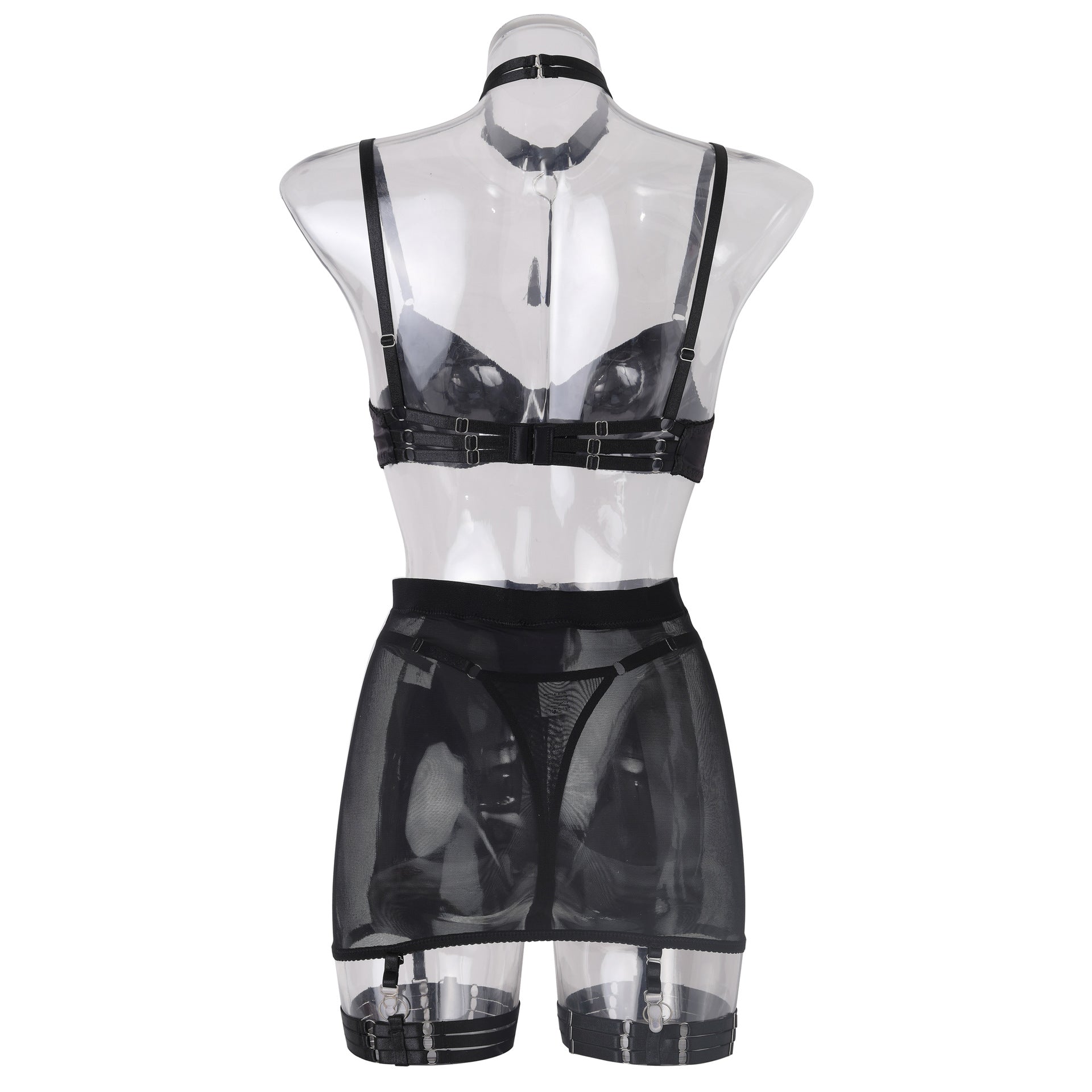 Bralette, skirt, necklace, garter set, thongs